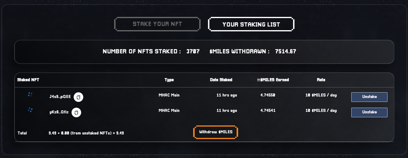 현재 MHAC NFT 발행량은 총 6,200개이며, 이들을 스테이킹하여 $MILES 토큰을 획득할 수 있습니다.