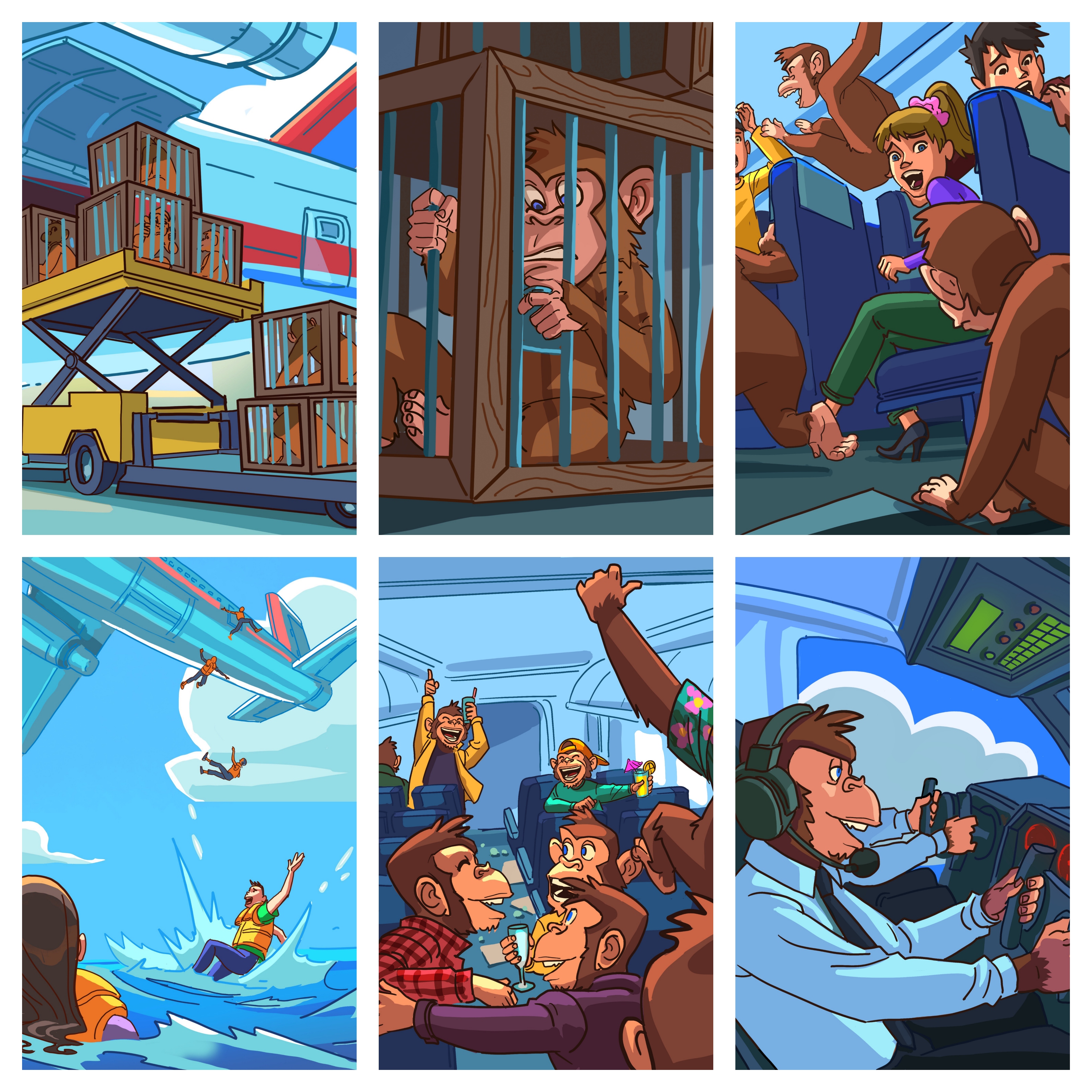 하지만 이송 과정에서 유인원은 잠에서 깨어났고 무슨 일인지 깨닫게 되었습니다. 유인원 중 하나가 자신의 케이지를 탈출한 후 나머지 유인원을 풀어줍니다. 화물 칸 문이 닫히자 유인원는 케이지를 풀고 거대한 여객기를 장악할 계획을 세웠습니다.