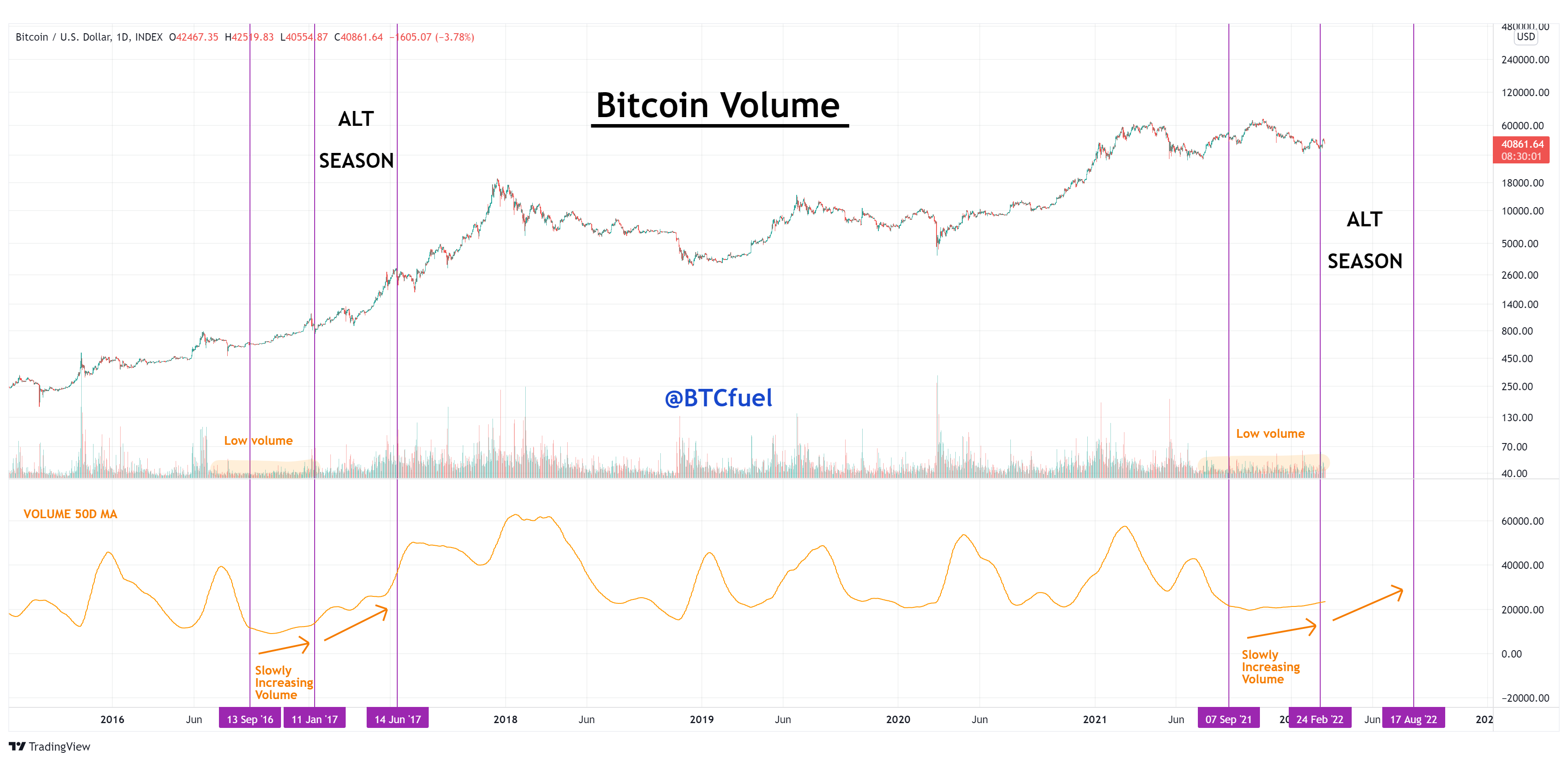 @BTCfuel 에 따르면 현재 비트코인 거래량은 2017년 초대형 알트코인 불장을 시작할 때처럼 바닥을 찍었고, 만약 이 거래량이 서서히 증가한다면 조만간 초대형 알트코인 시즌이 올 수 있는 조건이 완성된다고 분석합니다.