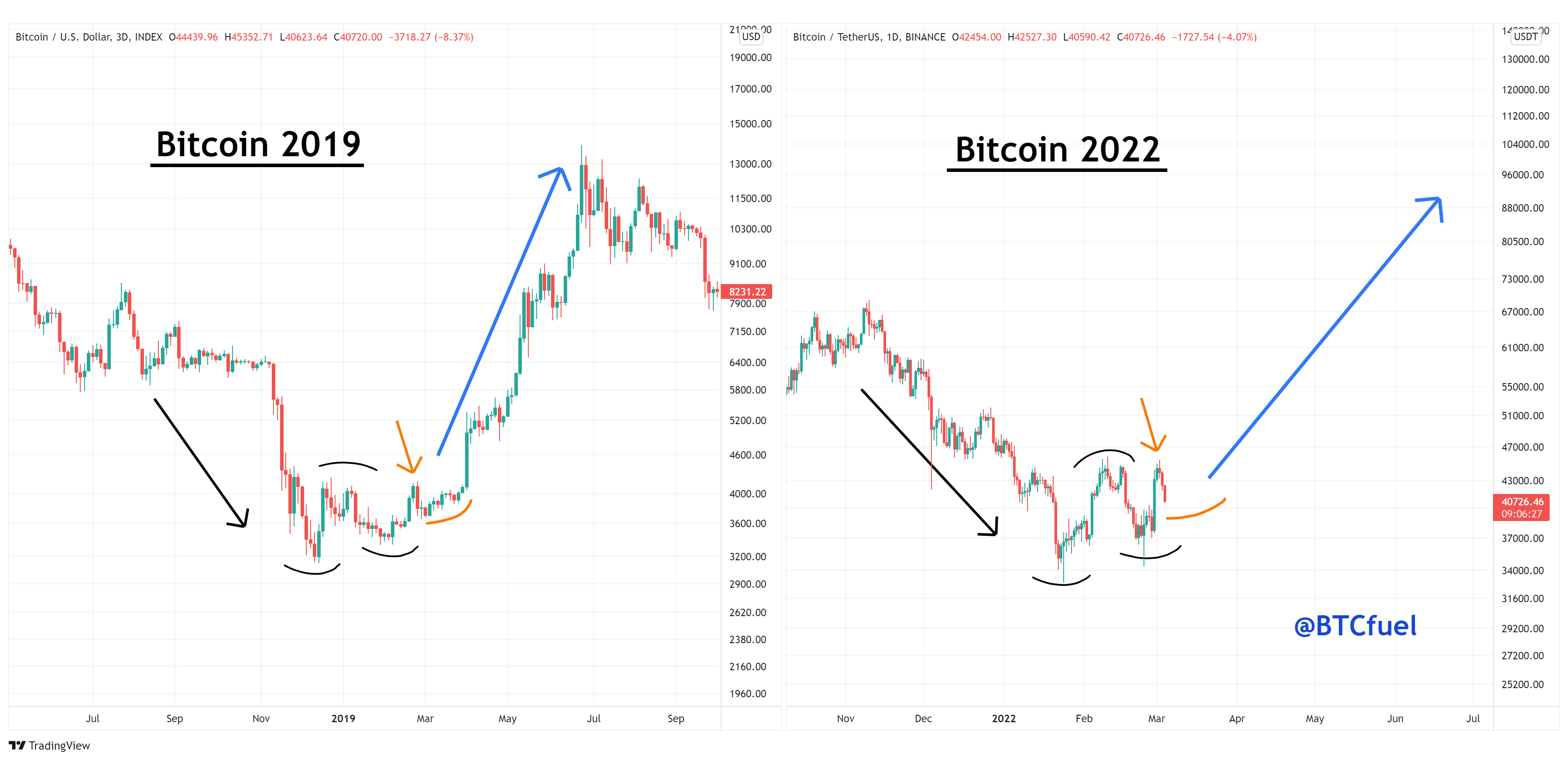 암호화폐 기술적 분석으로 유명한 트위터 @BTCfuel에 따르면 비트코인 3일 차트를 볼 때 2022년 현재 비트코인 가격이 2019년 바닥을 찍었을 때와 매우 유사한 프랙탈을 보여주고 있다고 합니다.
