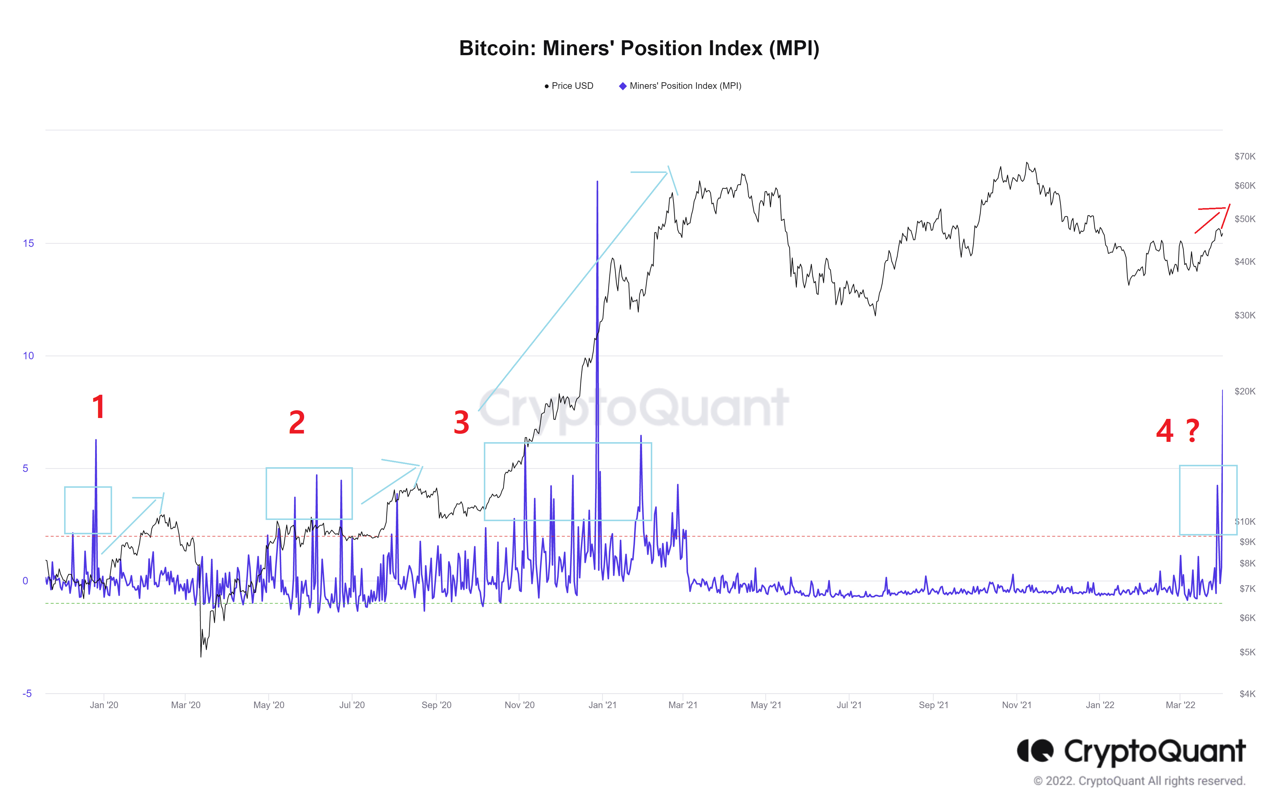 위 차트에서 아래쪽에 보라색 실선은 MPI 값을 나타내고, 검은색 선은 비트코인 가격입니다. 그리고 MPI 지표에 있는 붉은선 점선은 MPI 값 2의 기준선입니다. MPI가 붉은 점선(2) 이상이면, 대부분의 채굴자가 비트코인을 매도하고 있다는 뜻으로 해석합니다.