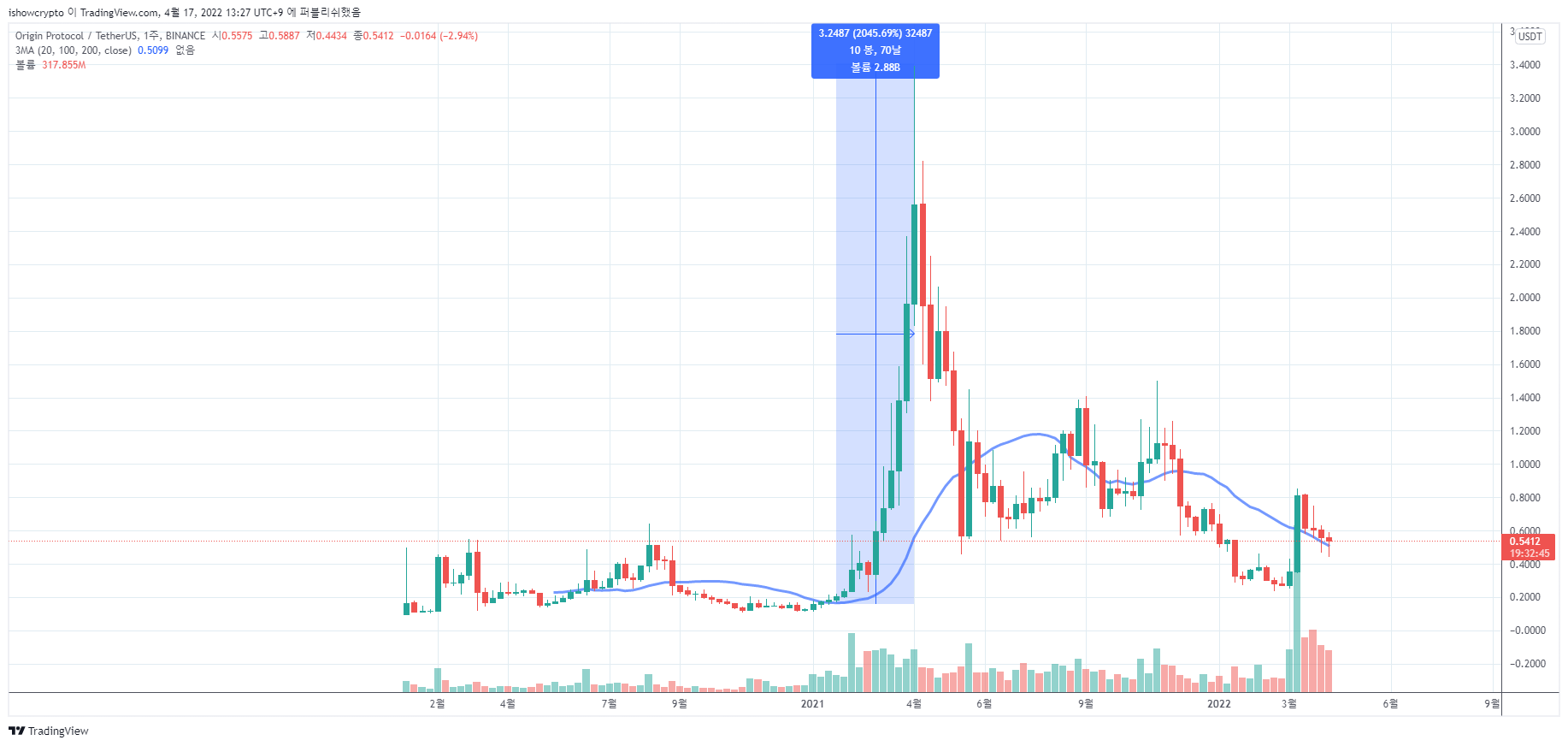 위 차트는 OGN 코인 주봉차트입니다. 보시는 바와 같이 OGN 코인 역사상 가장 큰 거래량이 발생한 것을 확인할 수 있습니다. 위와같은 거래량이 터졌다는 점은 누군가 OGN 코인의 호재를 알고 대량으로 매집했다거나, 악재를 예상하고 시장에 팔았을 경우를 생각해볼 수 있습니다.