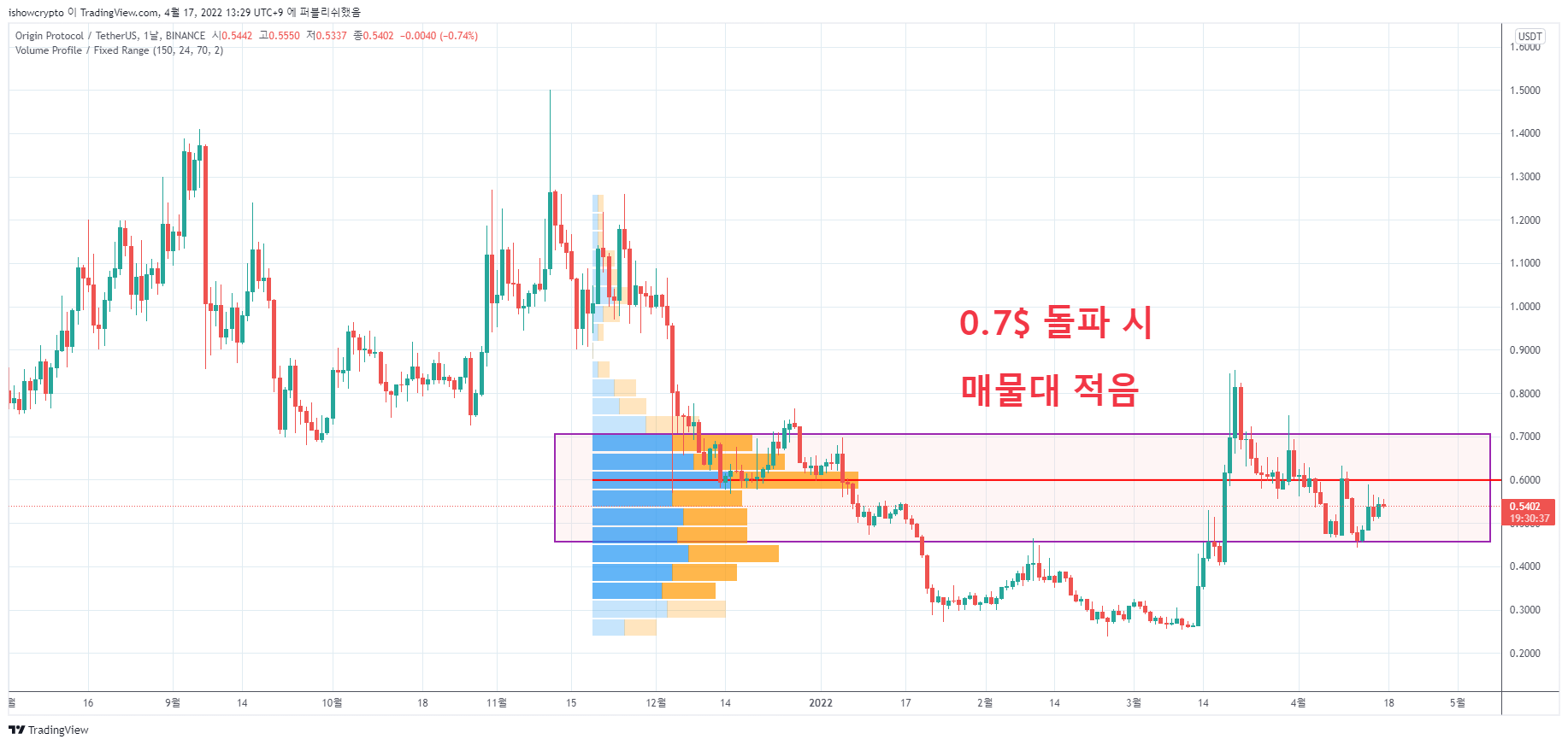 OGN 코인이 크게 상승하기 위해서는 가장 큰 매물대가 있는 0.7$ 부근을 강력하게 돌파해야합니다. 몇 주전 강력한 상승이 나오고 매물대에서 저항을 받고 다시 빠진 상황이지만 20주 이동평균선의 지지 부근에서 매수한다면 다음 상승에 대한 기대감을 높일 수 있습니다.