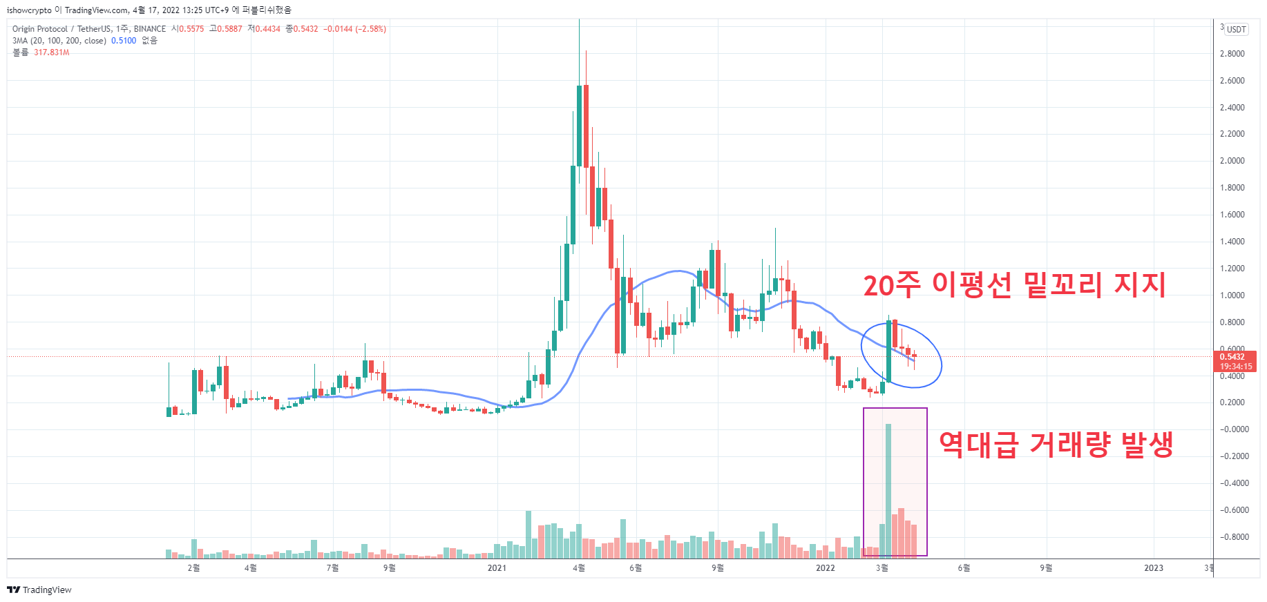 상승에 대한 강력한 지지선인 20주 이동평균선을 지켜주면서 밑꼬리를 만드는 모습입니다. 이와 같은 20주 이평선을 지지했을 때 과거 OGN 코인 상승 모멘텀은 강력했습니다.