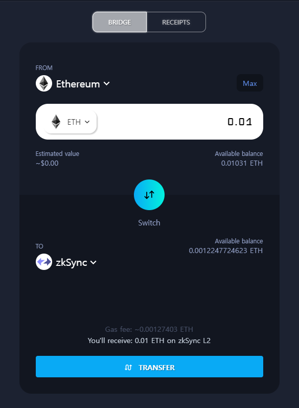 1) zksync 브릿지 사용해서 레이어1 > 레이어2 ETH 전송