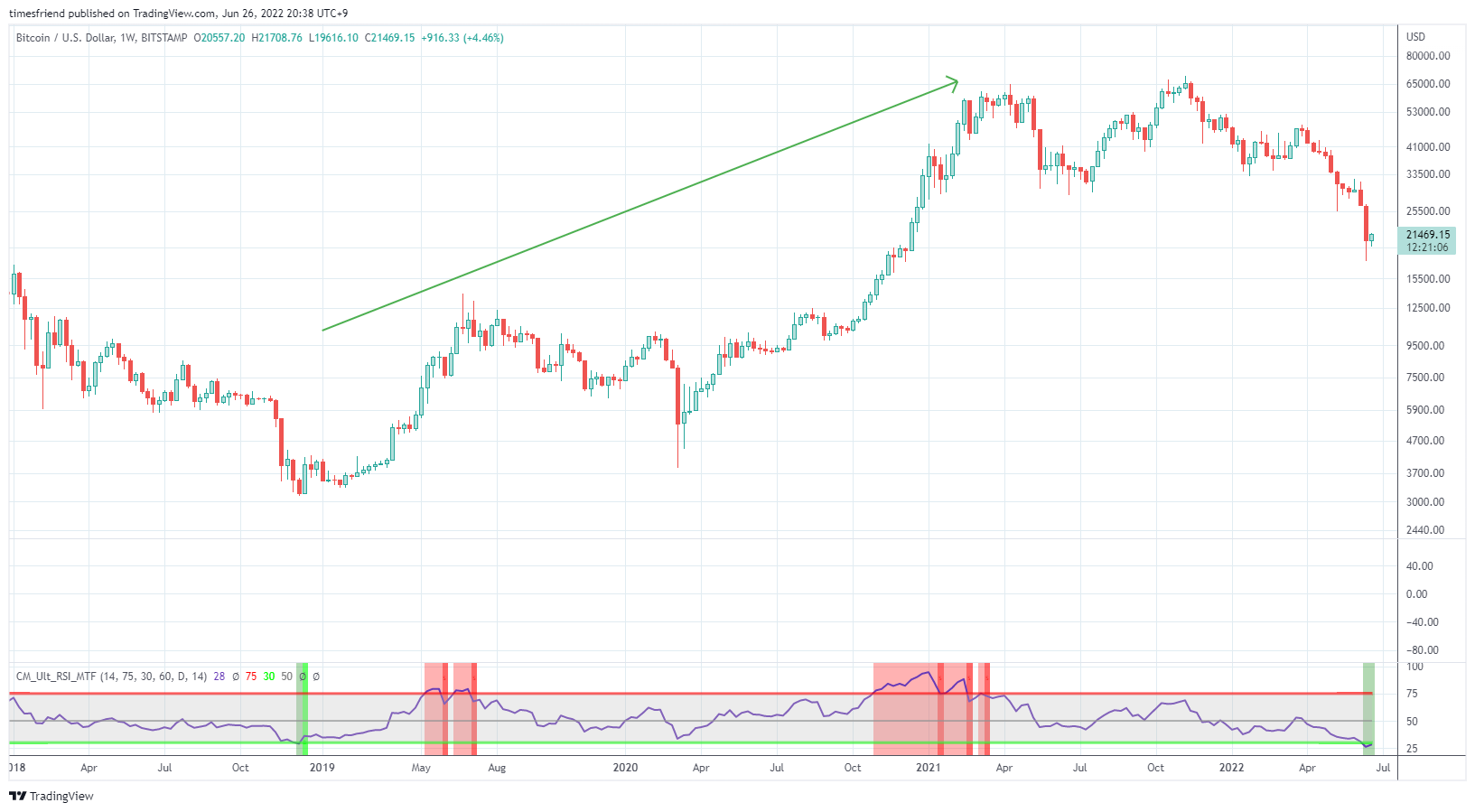 또 하나의 강력한 상승 시그널 중 하나는 비트코인 주봉상 RSI 과매도 구간은 역사적으로 매수의 기회였다는 점입니다. 2015년1월 당시 200달러 구간에서 RSI 과매도(매수시그널)가 발생했고, 이후 3년동안 20,000달러까지 100배 상승합니다.