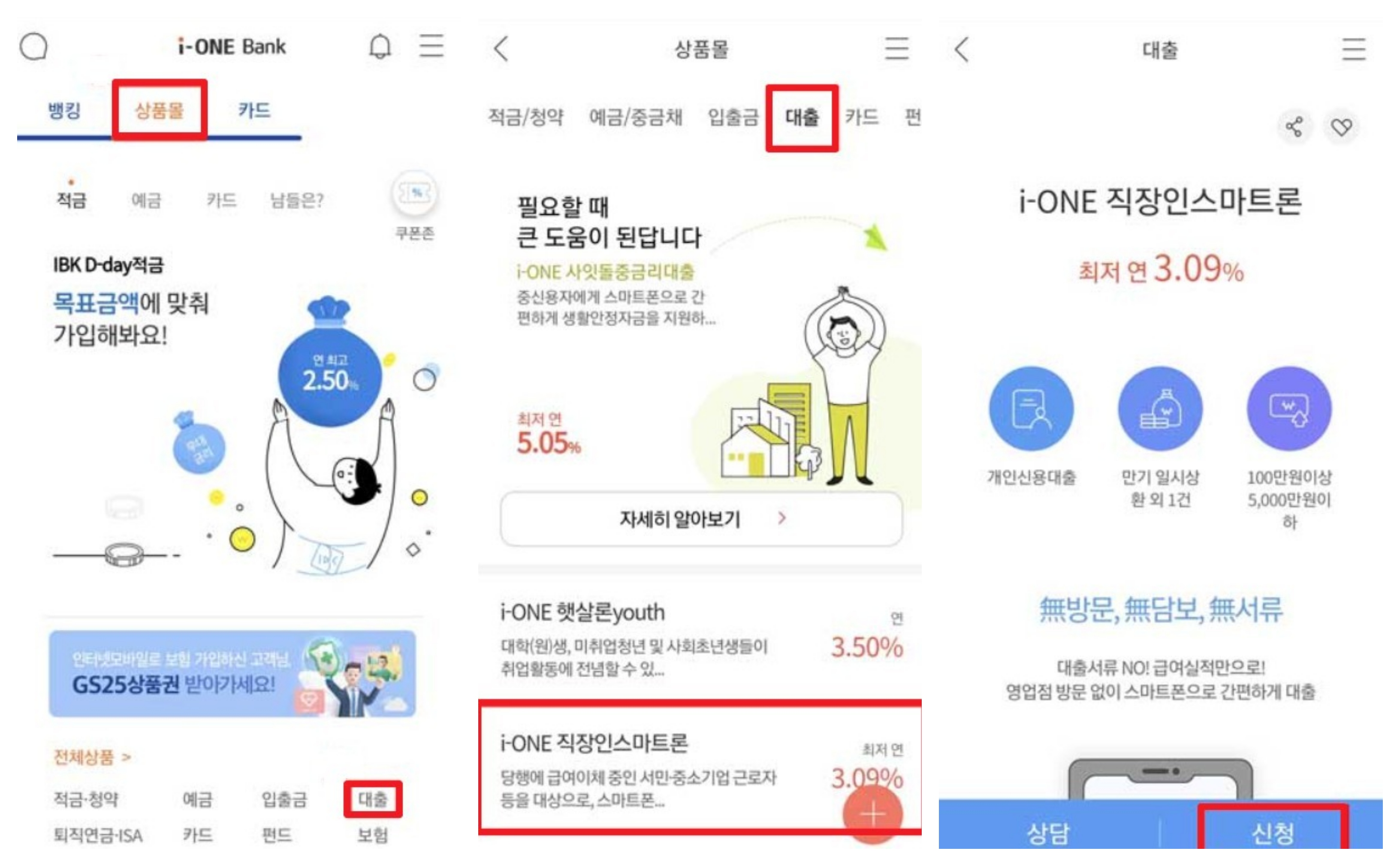 i-one 뱅크 어플 다운로드 - 상품몰 - 대출 - i-one 직장인스마트론 클릭 - 신청 클릭