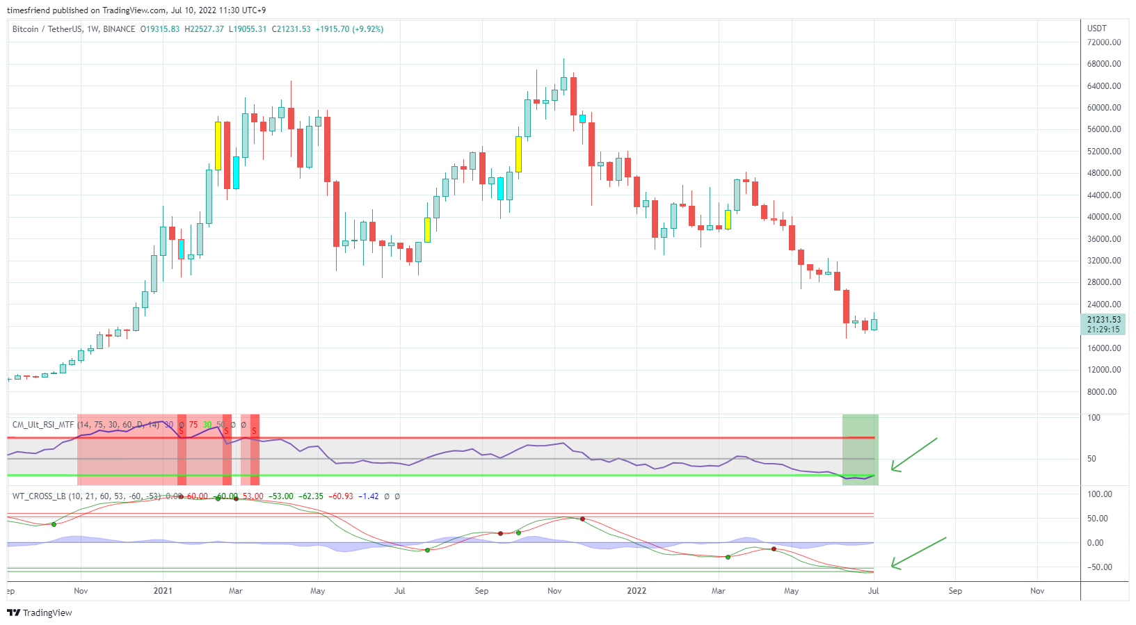 비트코인 가격이 현재 매우 저점이라고 생각하는 또 한가지 이유는 주봉 상 보조지표에서 매수자리를 보여주고 있기 떄문입니다. 여기서 생각해봐야할 점이 주봉 상 매수 자리는 몇 년에 한번 나타나는 자리라는 점입니다.