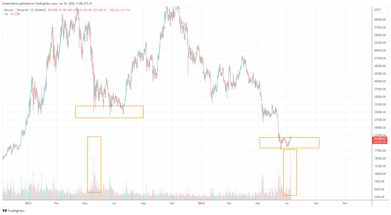 비트코인 시세가 지금이 바닥 부근이라 생각하는 결정적인 이유는 거래량입니다. 위 차트는 비트코인 일봉입니다. 보시는 바와 같이 2021년 조정 부근에서 매집했을 때보다 훨씬 큰 거래량이 현재 차트의 하단 부근에서 발생했습니다.