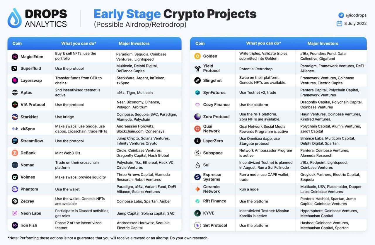 아래 그림은 Icodrop에서 발표한 2022년7월8일 기준 잠재적인 에어드랍 list 입니다.