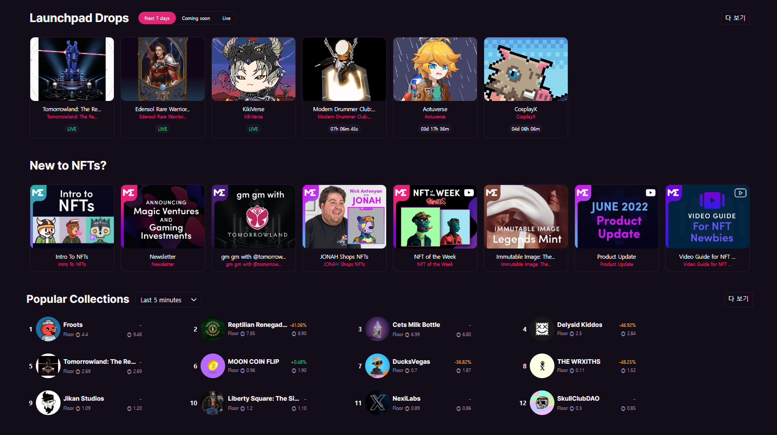 - 솔라나의 NFT 거래소로 매직에덴 거래소에서 NFT를 사고 팔면 에어드랍을 기대할 수 있습니다. 주요 투자자로 패러다임, 세퀴오아, 코인베이스 등이 있습니다.