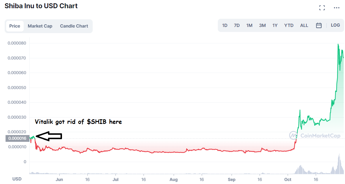 비탈릭 부테린이 shib 코인을 매도한 2021년5월부터 시바이누 코인은 하락세로 접어듭니다. 하지만 5개월이 지난 2021년10월부터 거래량이 터지면서 급격한 상승을 시작했고, 이후 100배 이상 오르는 대박을 터뜨렸습니다.