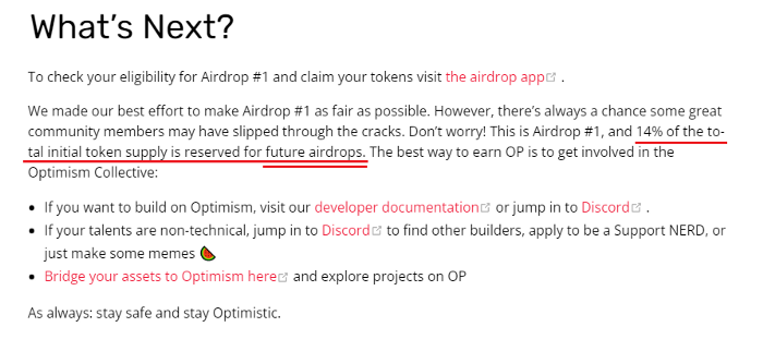 2022년5월 첫번째 OP 코인 에어드랍 후 전체 OP 토큰 발행량의 14%를 향후 에어드랍을 위해 배정한다고 명시했습니다. 그럼 위의 14% 에어드랍을 받기 위해서 어떻게 해야하는가 궁금하실 겁니다.