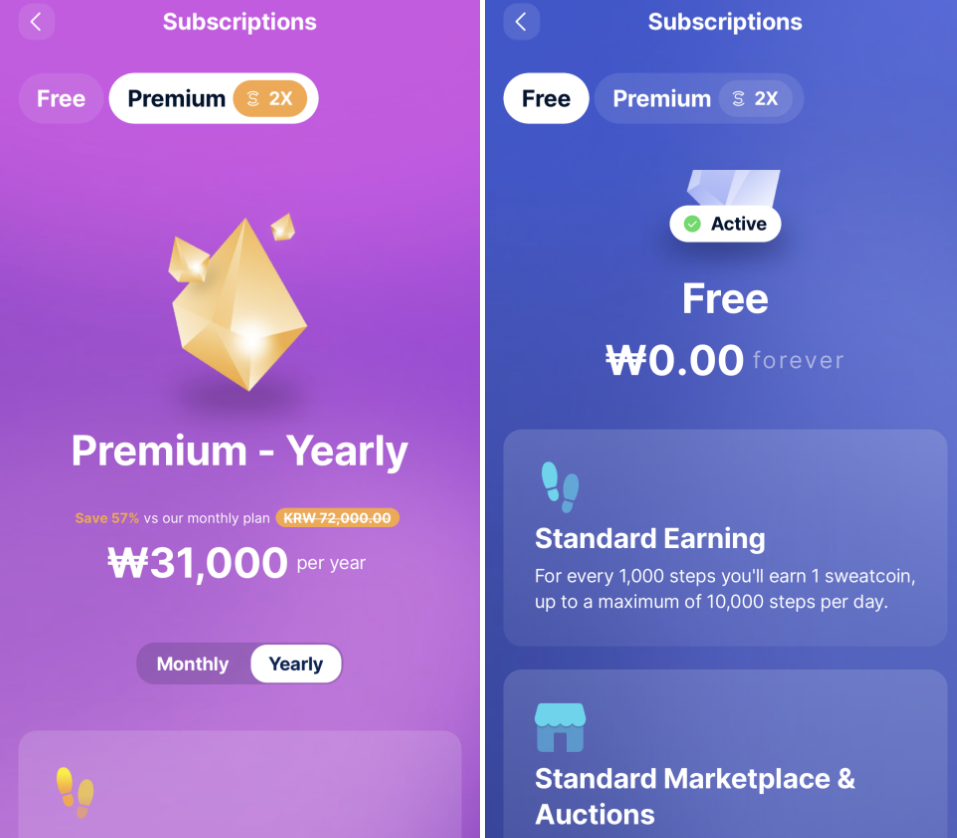 마지막으로 프리미엄 플랜 제도가 있습니다. 이는 2배씩 코인을 받는 것인데, 1년에 31,000원을 지불하는 유료서비스입니다. 사실 스웨트코인의 가치가 얼마일 지 모르는 상황에서 굳이 프리미엄 플랜을 사용해서 채굴 속도를 올릴 필요가 있는 지 의문이 듭니다.