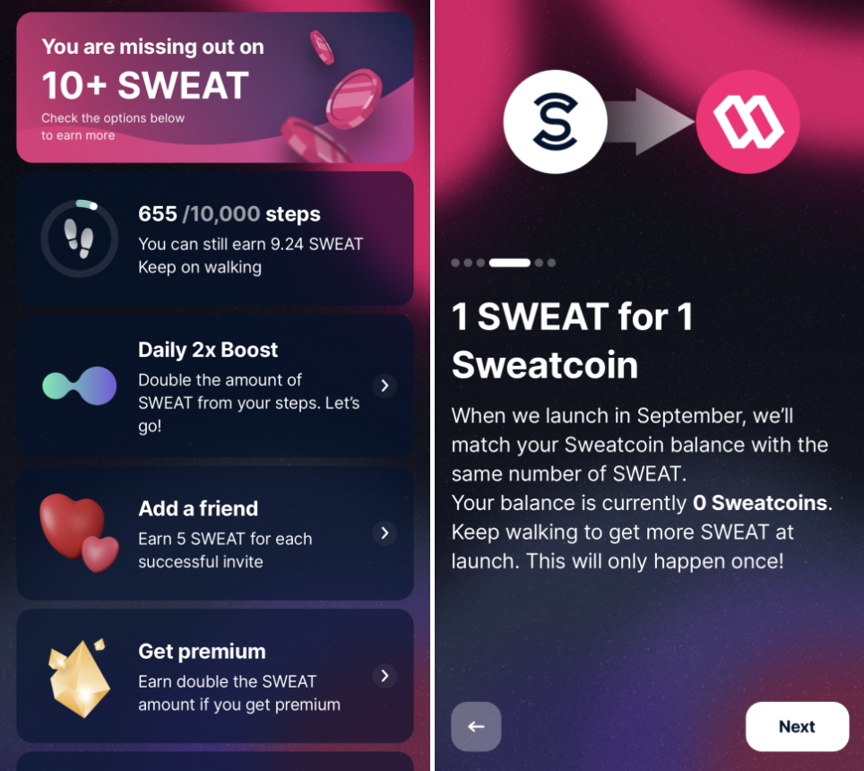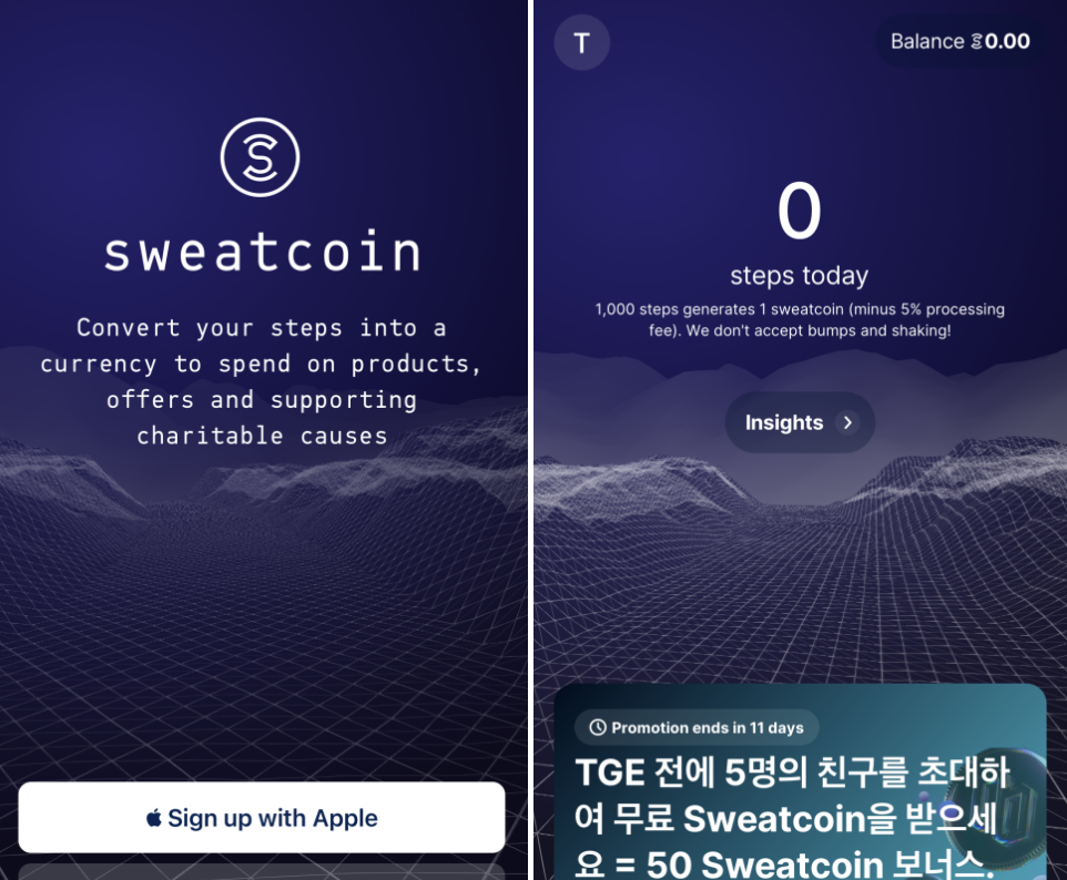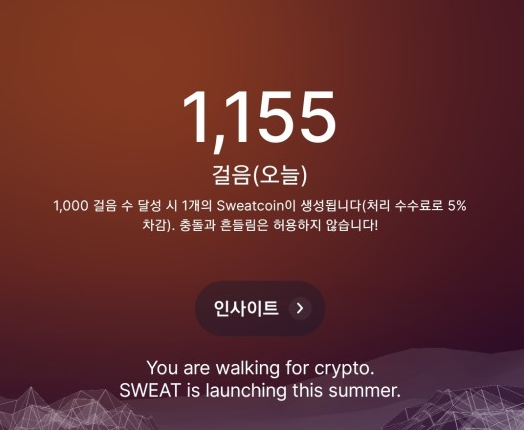 스웨트코인(SWEAT)은 9월12일 토큰 생성을 앞두고 있으며, 현재 아무런 조건없이 App 설치 후 걷기만 하면 보상이 주어집니다. 초기 비용 자체가 드는 것이 없기 때문에 9월12일 스웨트코인 상장 후 가격 덤핑이 일어나도 손해볼 것이 없어 기회가 된다면 무조건 참가해야하는 프로젝트입니다.