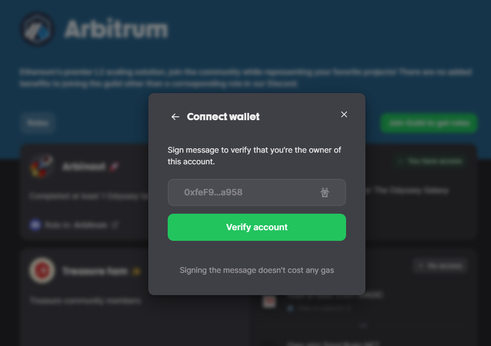 다음으로 지갑이 연결되면 verify wallet 화면이 나옵니다. 이 때 지갑에 서명 확인 창이 나오면 확인을 눌러줍니다. 그리고 나서 디스코드 계정을 연결해줍니다.