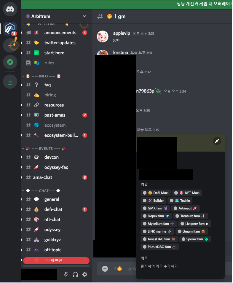 먼저 준비물은 아비트럼 네트워크에 소량(약 0.05eth)의 이더리움, 메타마스크 지갑, 그리고 디스코드 계정입니다.