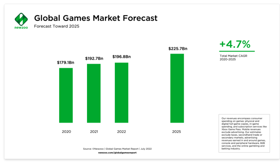 게임 마켓데이터 업체 NEWZOO에 따르면 전세계 게임 산업은 1,000억 달러 이상의 연간 수익을 창출하고 있으며, 2024년에는 2,000억 달러를 너머설 것으로 추청합니다. 뿐만아니라 레딧 공동창업자 알렉시스 오하니안은 P2E 게임이 전체 게임 산업의 90% 이상을 점할 것으로 전망하기도 했습니다.