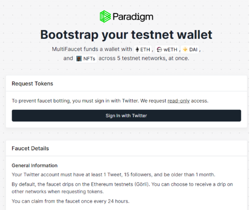 트위터 계정으로 로그인합니다. 테스트넷 이더리움의 범람을 막고자 트위터 계정은 1개월 이상, 팔로워 15명이 넘어야합니다. 잠시 후 내 메타마스크 지갑에 gETH 가 들어온 것을 확인할 수 있습니다.