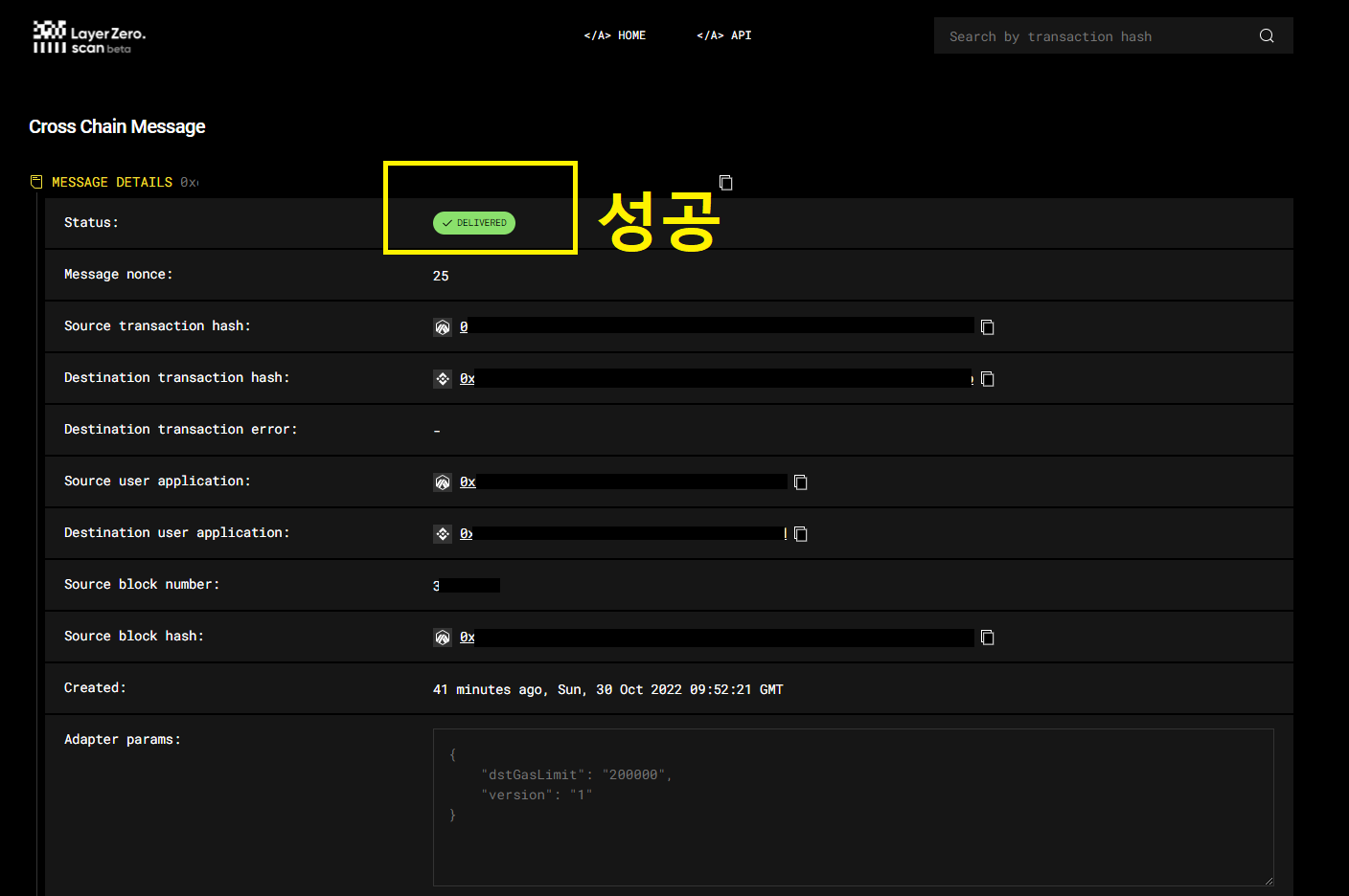 브릿지 전송이 완료되면 위와 같이 LAYERZEROSCAN에서 기록을 확인할 수 있습니다.