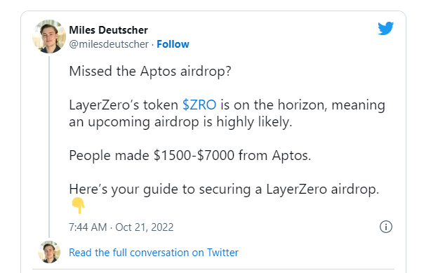 먼저 활발하게 에어드랍 정보를 공유하는 해외 트위터에 따르면 레이어제로의 토큰인 ZRO 토큰 발행 가능성이 매우 높음을 언급했습니다.