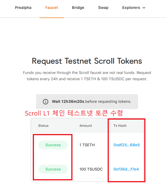 테스트넷 토큰을 수령합니다. (24시간마다 1번 가능)