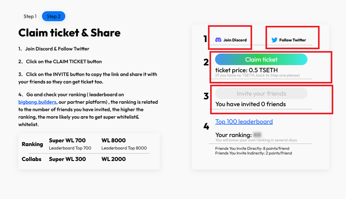 Step2에서 디스코드 연결 -> 트위터 연결 -> 클레임 티켓(L2 체인 TSETH 0.5이상)을 순차적으로 진행합니다.