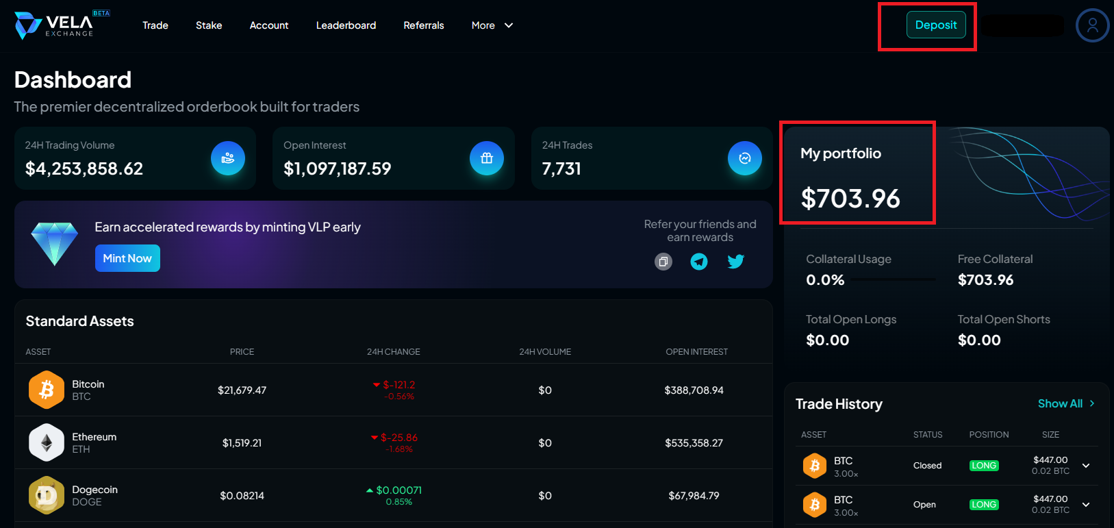 다음으로 VELA 거래소로 USDC를 입금해야 합니다.