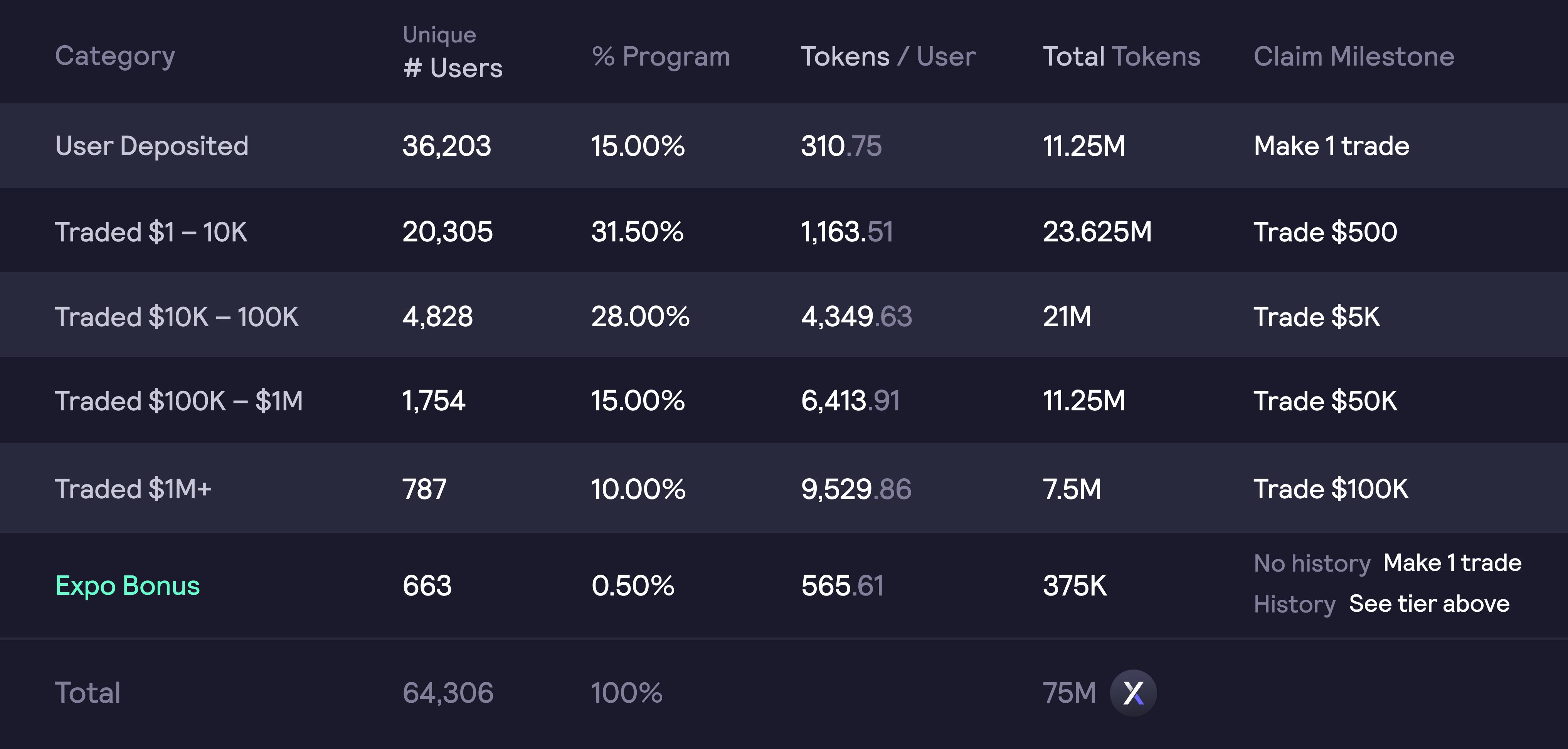DYDX 거래소에 한번이라도 입금했다면 에어드랍을 받을 수 있었고, 일정한 금액의 거래 볼륨에 따라 에어드랍 조건이 적용되었습니다.