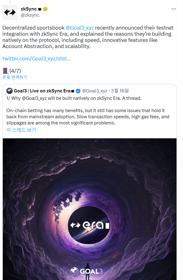 이번에 관심가져볼 프로젝트는 Goal3 라는 dapp입니다. Goal3는 분산형 스포츠베팅 게임으로 zksync 팀에서 구축 예정인 프로젝트로 zksync 트위터에 직접 언급되었습니다.