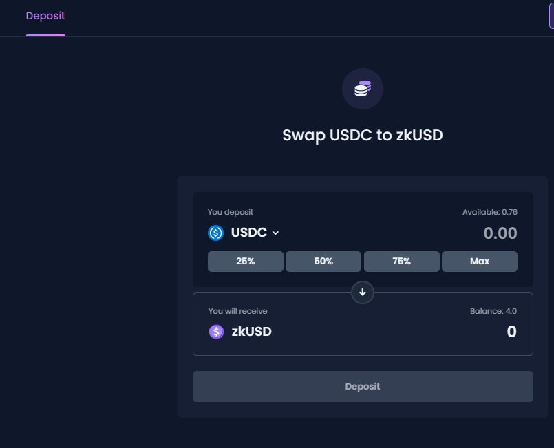 deposit 화면에서 USDC를 zkUSD로 바꿔줍니다. 이 때, 스왑을 위한 소량의 eth 수수료가 발생하므로 zksync era 메인넷에 eth가 있어야합니다.