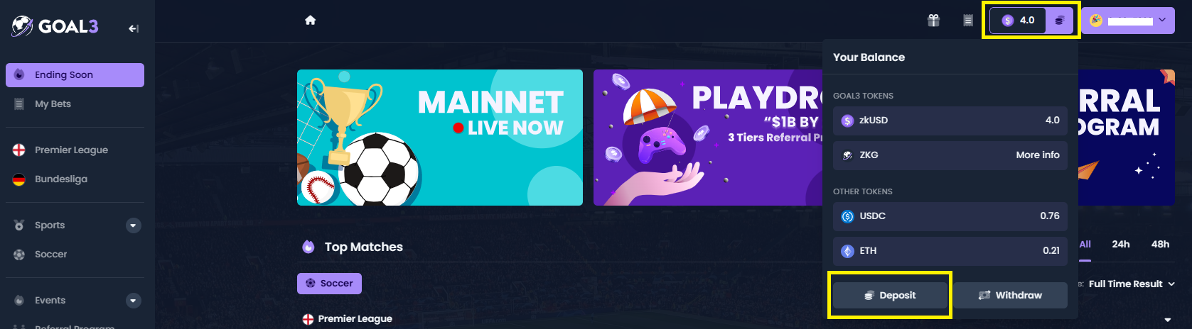 스왑이 완료되면 다시 Goal3 메인화면으로 이동합니다. 이제 화면 우측 상단에 자신이 입금한 zkUSD 수량이 보일겁니다.
