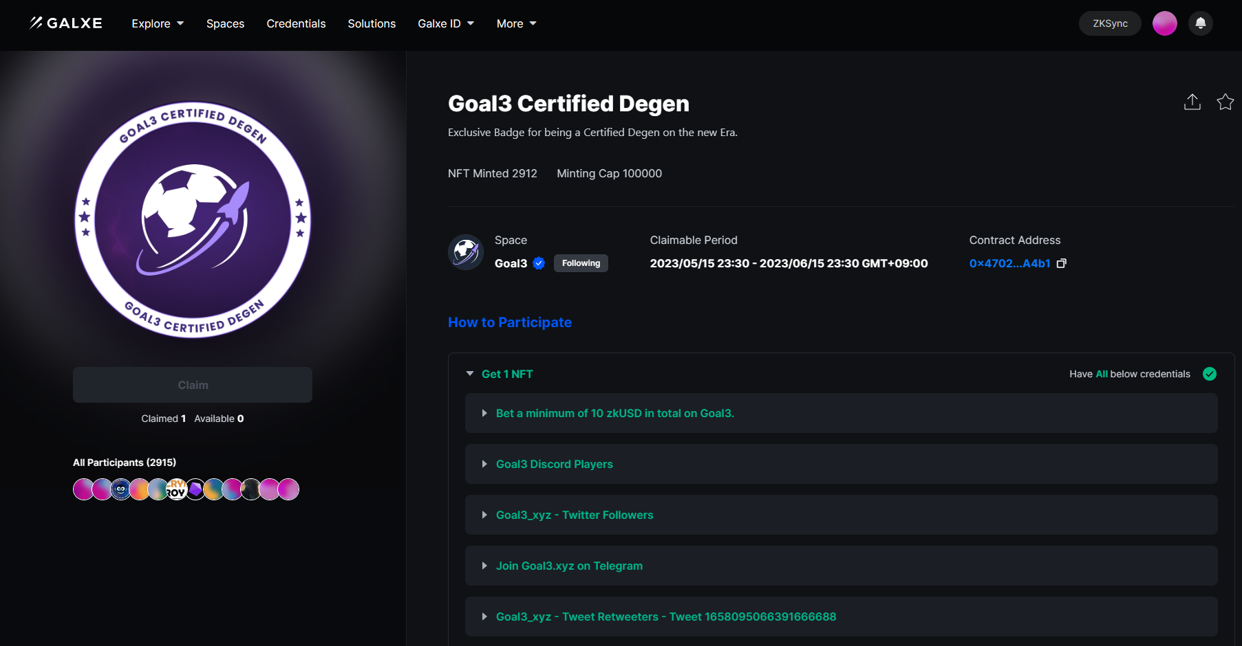 제가 앞에서 10 USDC 이상 스왑하라고 한 이유를 설명하겠습니다. 현재 Goal3에서는 미션을 수행하면 Goal3 Certified Degen NFT를 부여하고 있습니다. 이것을 받아놓으면 향후 ZKG 토큰 에어드랍 시 확률이 올라갈 겁니다.