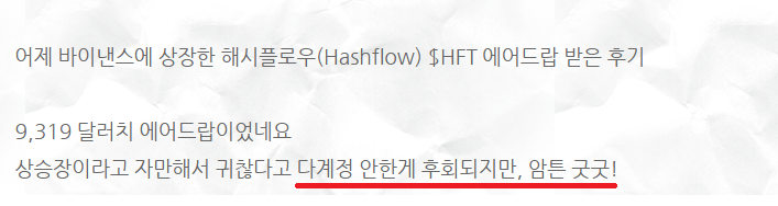국내 에어드랍 파밍의 1Tier이자 코인투자자들이라면 한번은 들어봤을 그 닉네임 쿠쿠쿱님이 있습니다. 자신의 블로그에 해시플로우 HFT 에어드랍 후기를 올렸던 쿠쿠쿱님은 HFT 토큰 에어드랍 후기를 올리면서 다계정을 안한 것이 아쉽다는 코멘트를 달았습니다.