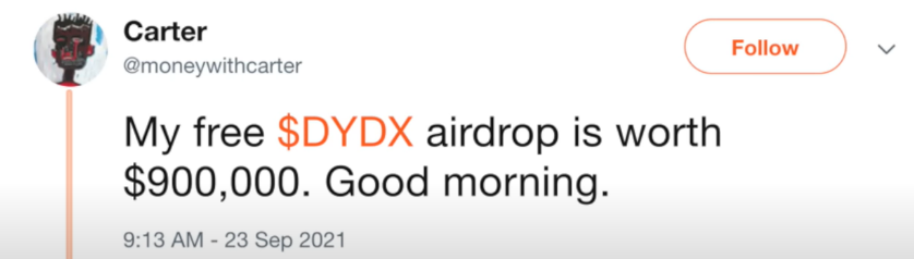 에어드랍 파머로 유명한 트위터명 Carter가 있습니다. 2021년9월에 DYDX가 에어드랍 될 때 전세계 거래소에 상장 소식이 이어지면서 DYDX 토큰 가격은 급등했고, Carter의 수익은 DYDX 다계정을 통해 90만달러에 이르게 됩니다.