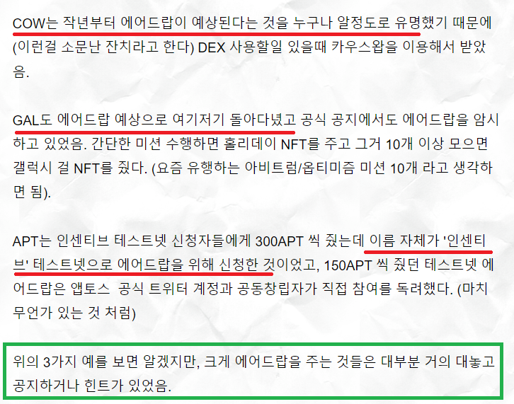 또한 소문난 잔치가 먹을 것이 없다는 속담과 반대로 에어드랍은 소문난 잔치가 실제로 먹여줄 확률이 더 높으므로 에어드랍 파머들이 무엇을 파밍하는지 잘 들여다보면 그 안에 답이 있다고 조언했습니다.