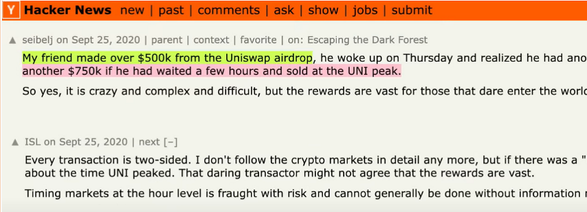 유니스왑을 파밍했던 한 유저는 유니스왑 다계정을 통해 약 50만달러의 에어드랍을 받고 매도했습니다. 하지만 얼마 후 UNI 토큰 가격이 상승했을 때는 무려 75만달러까지 수익을 낼 수 있어서 아쉬웠다라는 글입니다.