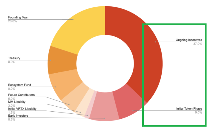 즉, 지금 Vertex 거래소 이용에 참여하면 Initial Token Phase(9.0%)의 사전 채굴을 할 수 있고, Ongoing incentives(37.0%)에 포함되어 에어드랍을 추가로 받을 수 있지 않을까 예상해봅니다.