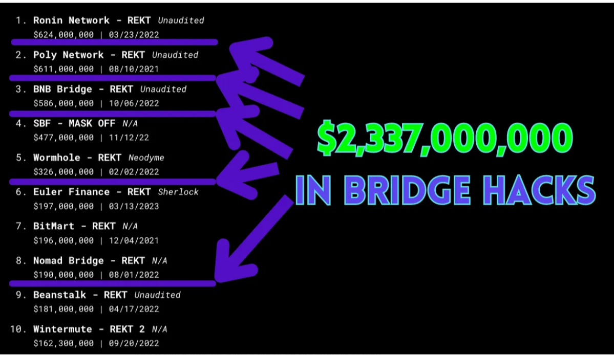 현재 체인 간 브릿징이 겪고 있는 가장 큰 문제는 해킹입니다. 이는 브릿지에 엑세스할 수 있는 소규모 중앙 집중식 그룹에 해커가 접근하여 자금을 탈취했음을 의미합니다.