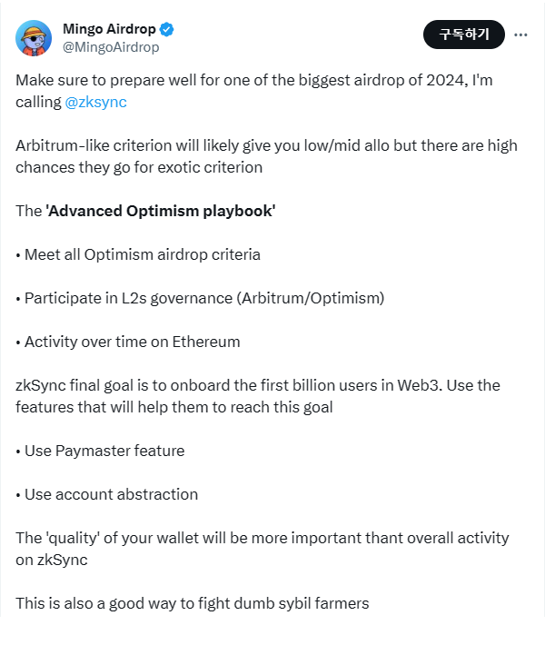 오늘은 twitter 에어드랍 알파로 알려진 @MingoAirdrop 이 짚어준 zksync 에어드랍을 위해 반드시 체크해야할 사항을 알아봅니다.