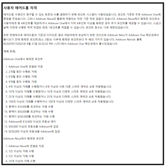 아비트럼 에어드랍 기준은 아비트럼 생태계에서 얼마나 많은 활동을 했는지에 따라 에어드랍이 주어졌습니다.