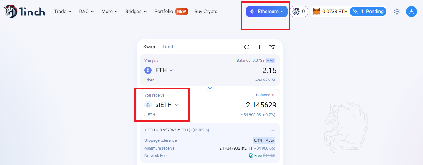 1) 1inch DEX 에서 ETH를 stETH로 스왑합니다.