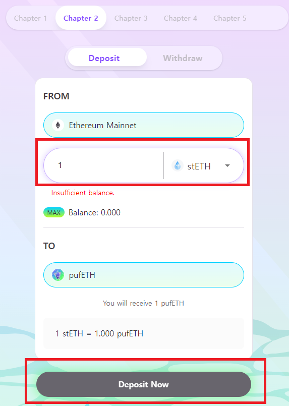 4) 다음으로 stETH를 입금하고 pufETH를 받습니다.