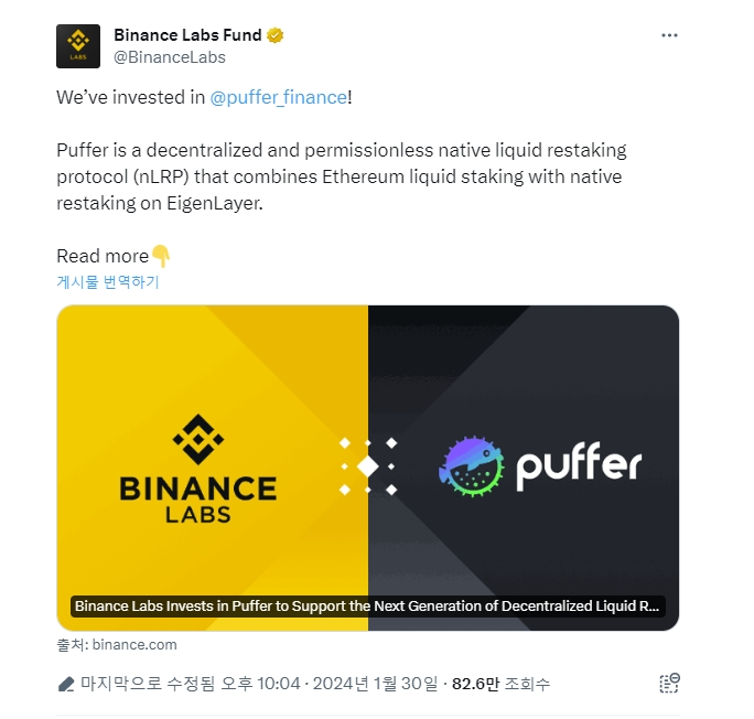퍼퍼 파이낸스는 Eigenlayer 위에 구축된 유동성 리스테이킹 프로토콜로 최근 바이낸스랩스의 투자를 받는 등 이더리움 리스테이킹 프로젝트 중 가장 주목을 받고 있습니다.