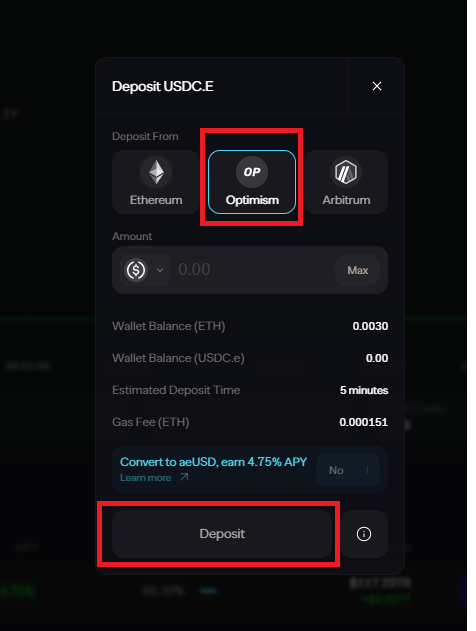 5) usdc.e 토큰을 Aevo거래소로 입금(옵티미즘)합니다.