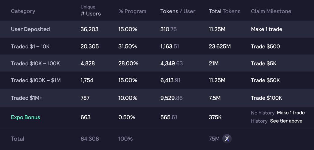 Aevo와 비슷한 사용자 수준이었던 dydx를 살펴보면 1만불, 10만불, 100만불이 에어드랍 볼륨 기준점입니다. 따라서 볼륨량을 늘리고 싶다고 생각하시면 위 표를 참고하셔도 좋을 거 같습니다.