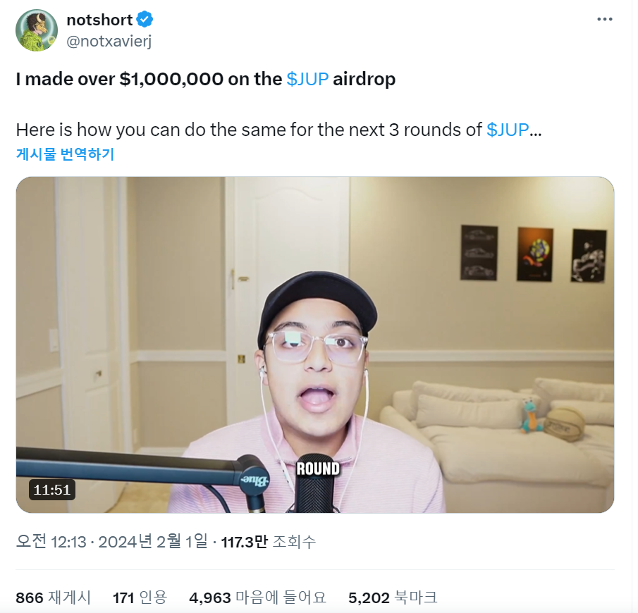트위터명 notshort를 쓰는 17세의 소년은 자신의 트위터에 12분짜리 비디오를 공유했습니다. 이 비디오에는 자신이 JUP 에어드랍으로 100만 달러를 번 인증과 전략을 공유했습니다