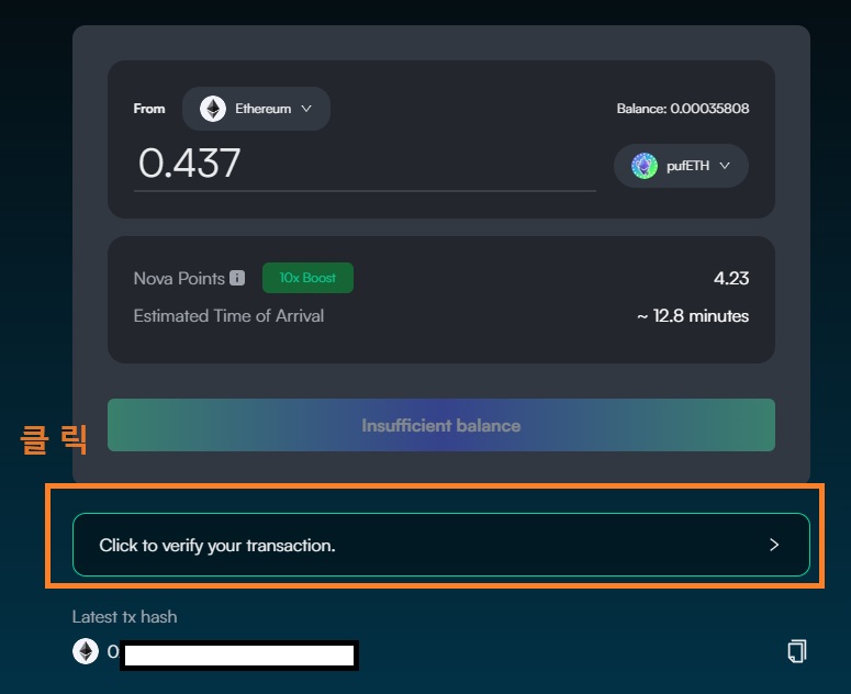 pufETH 입금이 반영되면, Nova network의 내 지갑으로 소량의 eth 수수료가 들어옵니다.
