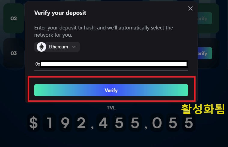 브릿지가 성공하면 "Click to verify your transaction" 버튼이 활성화됩니다. 클릭합니다.