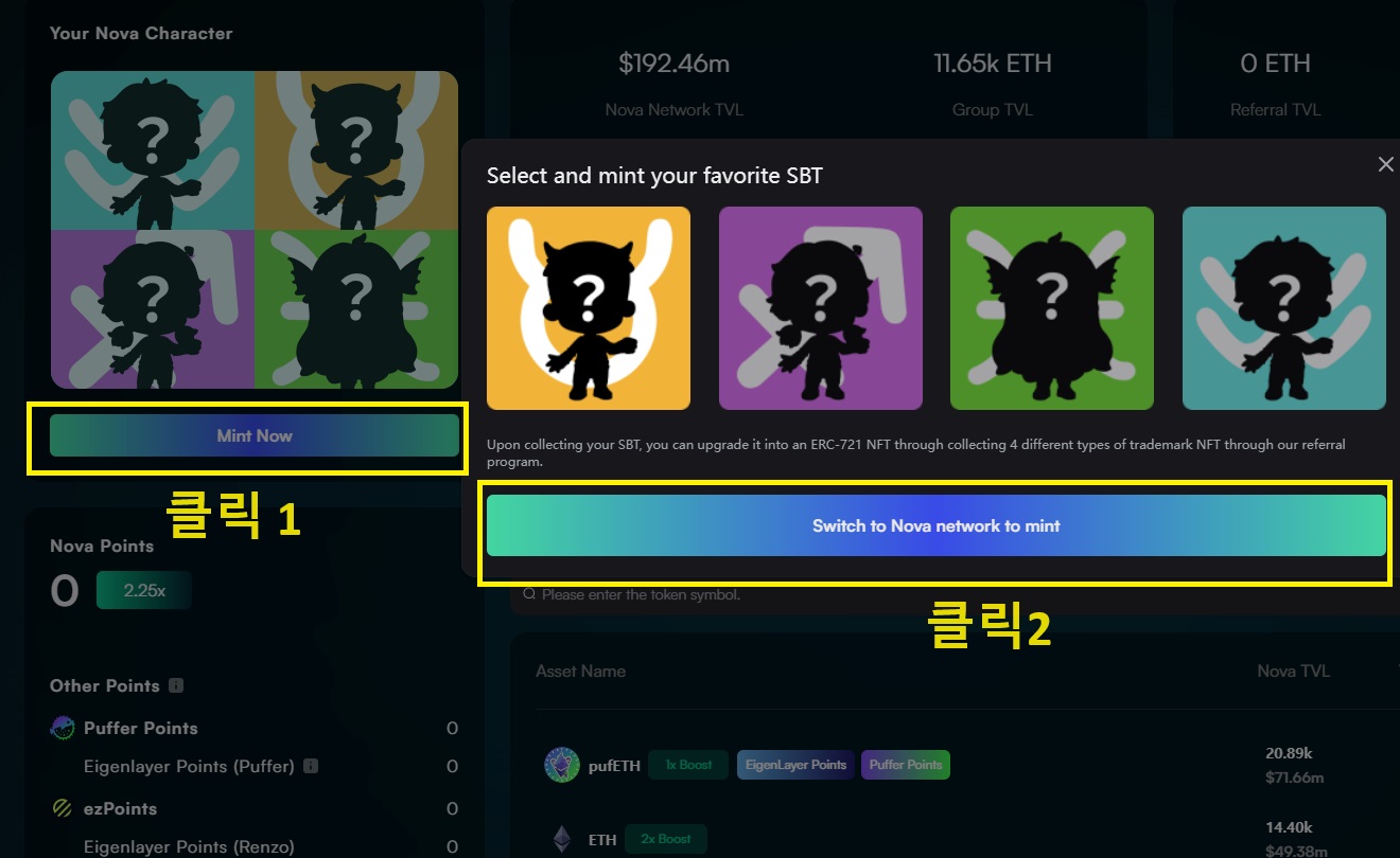 여기서 Mint Now 버튼 클릭하고 Nova network로 바꿔줍니다.